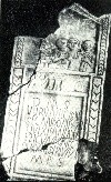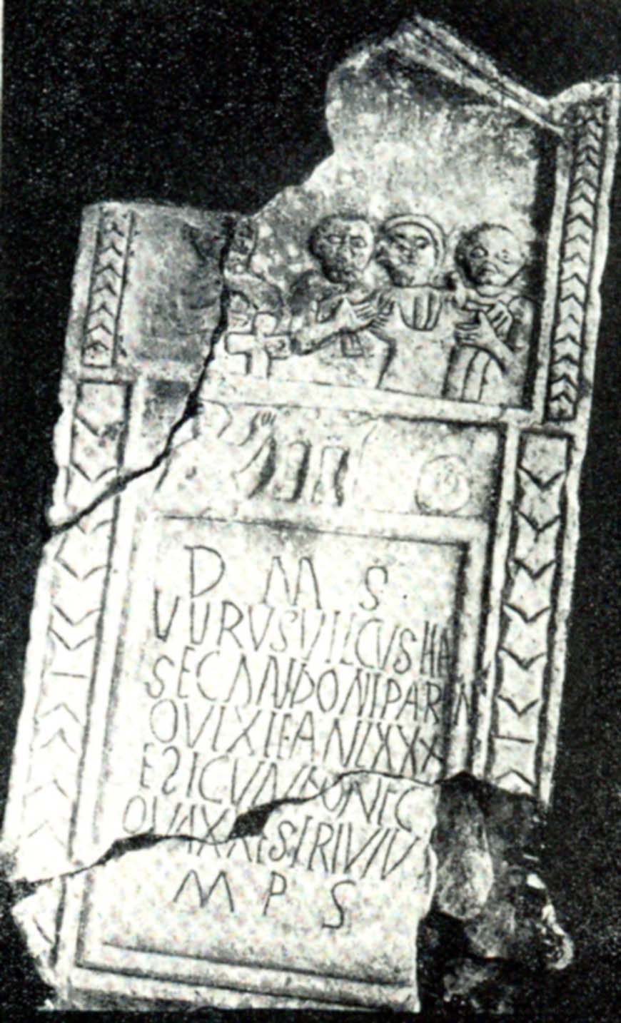 - Upper and left sides of the stele are broken off. Inscription field in a frame, cracked across lines 5 and 6.; above a relief field reperesenting a funerary banquet, and in the upper register with tympanon, four naively crafted busts, one holding a bird, and in front of the first bust, there is a cross.