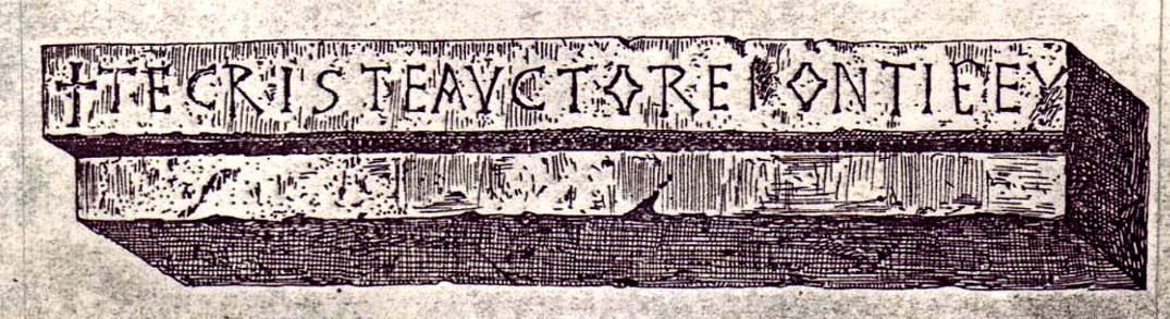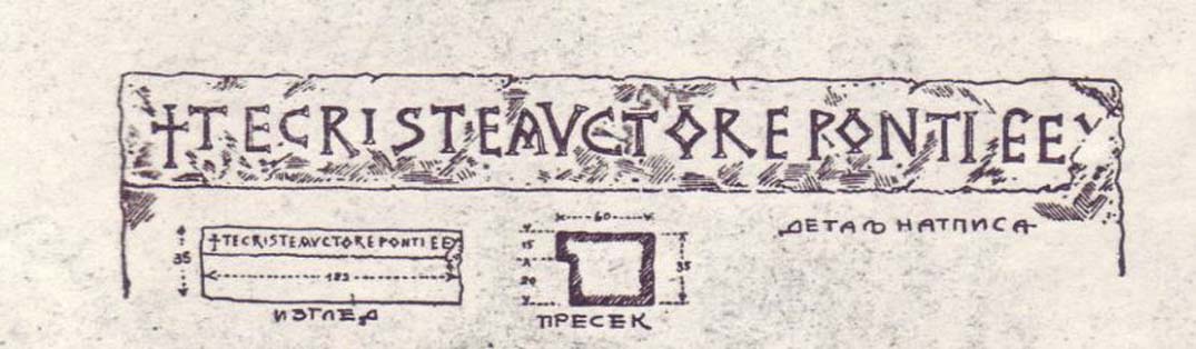 - Dimensions of the inscription field: h. 22,5, w. 185 cm. Letters: Cross at the beginning of the inscription. Romboid O, A whit a broken horizontal line.