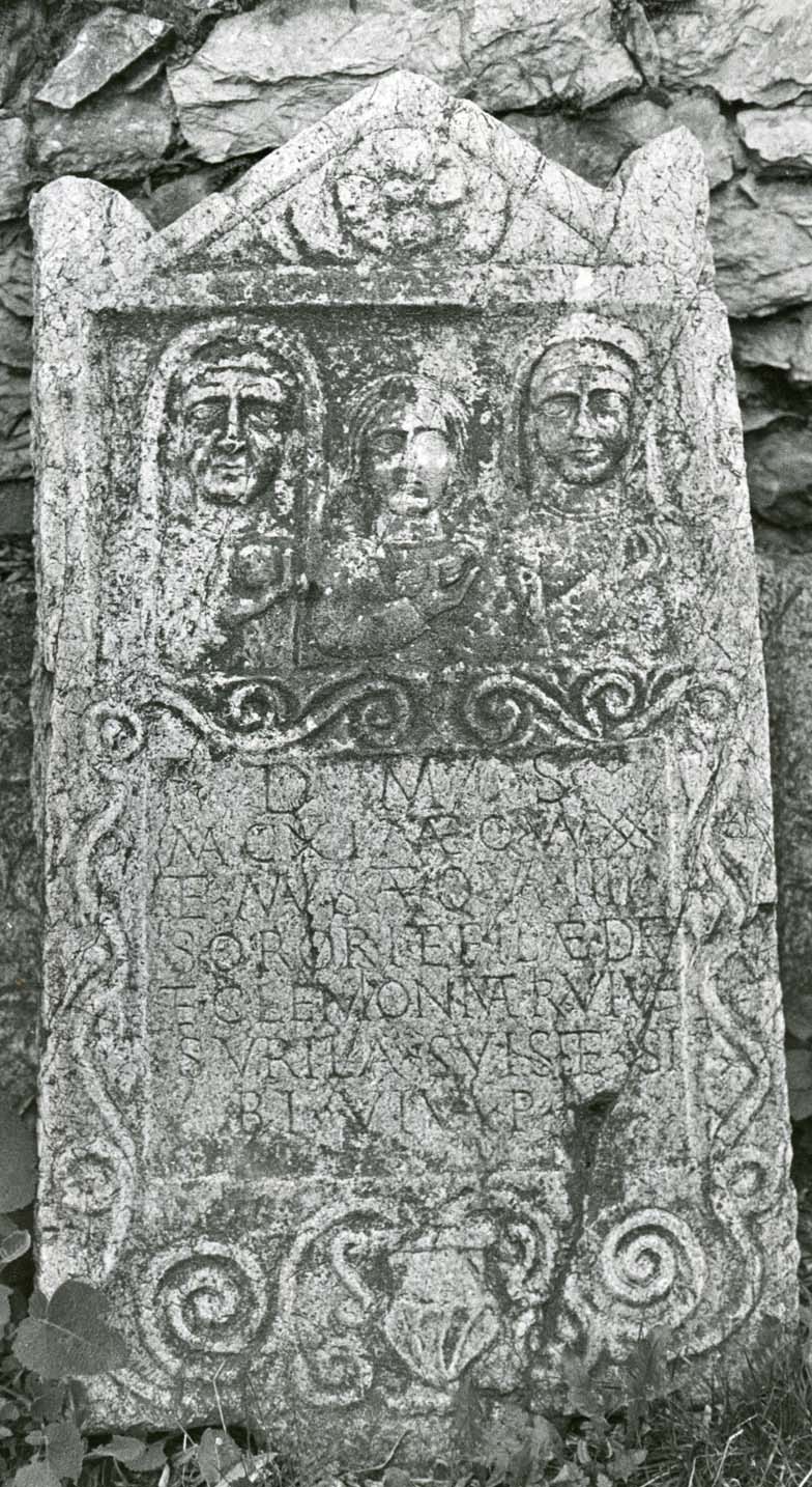 - In the upper register, relief representation of three female busts with veiled heads: on the left, an older vailed female holding an apple in the hand, on the right, a younger woman holding an ivy leaf, and in the middle, a girl holding a bird. In the register above, a pediment with a rosette and acroteria on the left and right