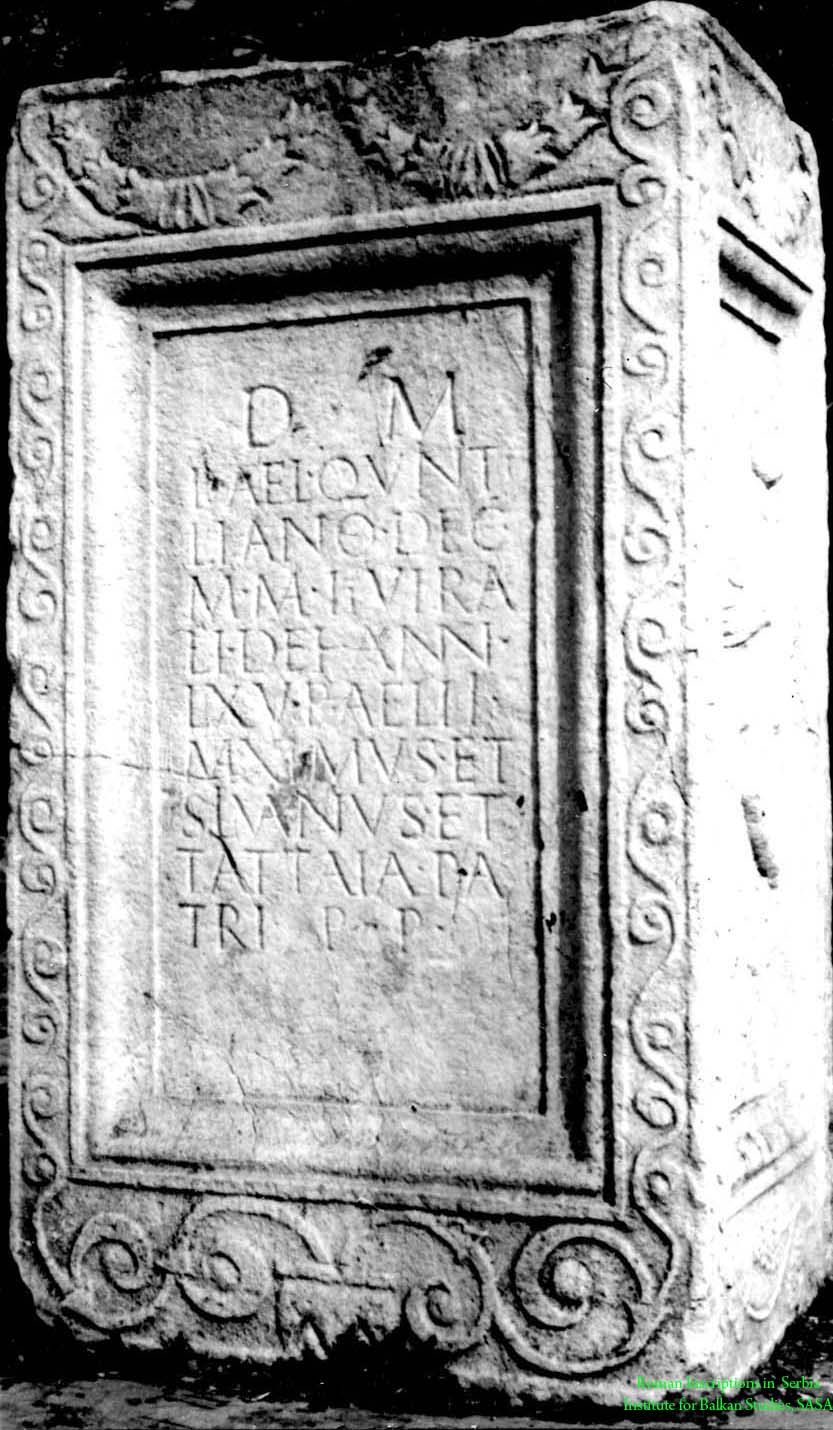 CIL 03, 01672 after:Boué 1940, 358; CIL 03, 01672 add. p. 1023 (after Šafarik); CIL 03, 08342; Vulić 1941–1948, 267 with Šafarik's drawing; ILJug 1488. https://www.zotero.org/groups/370316/digital_epigraphy_in_serbia/items/collectionKey/QR6X8D3N