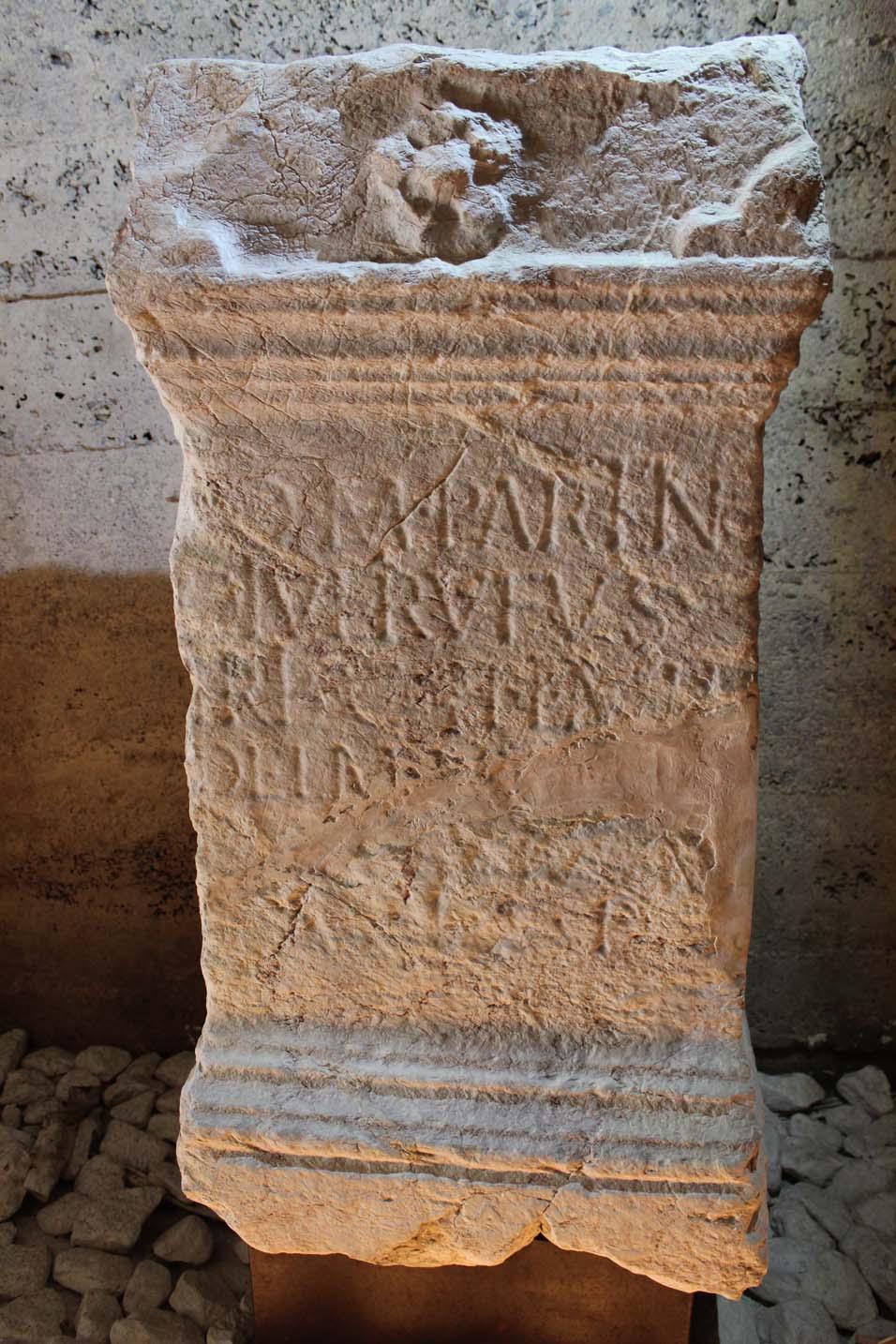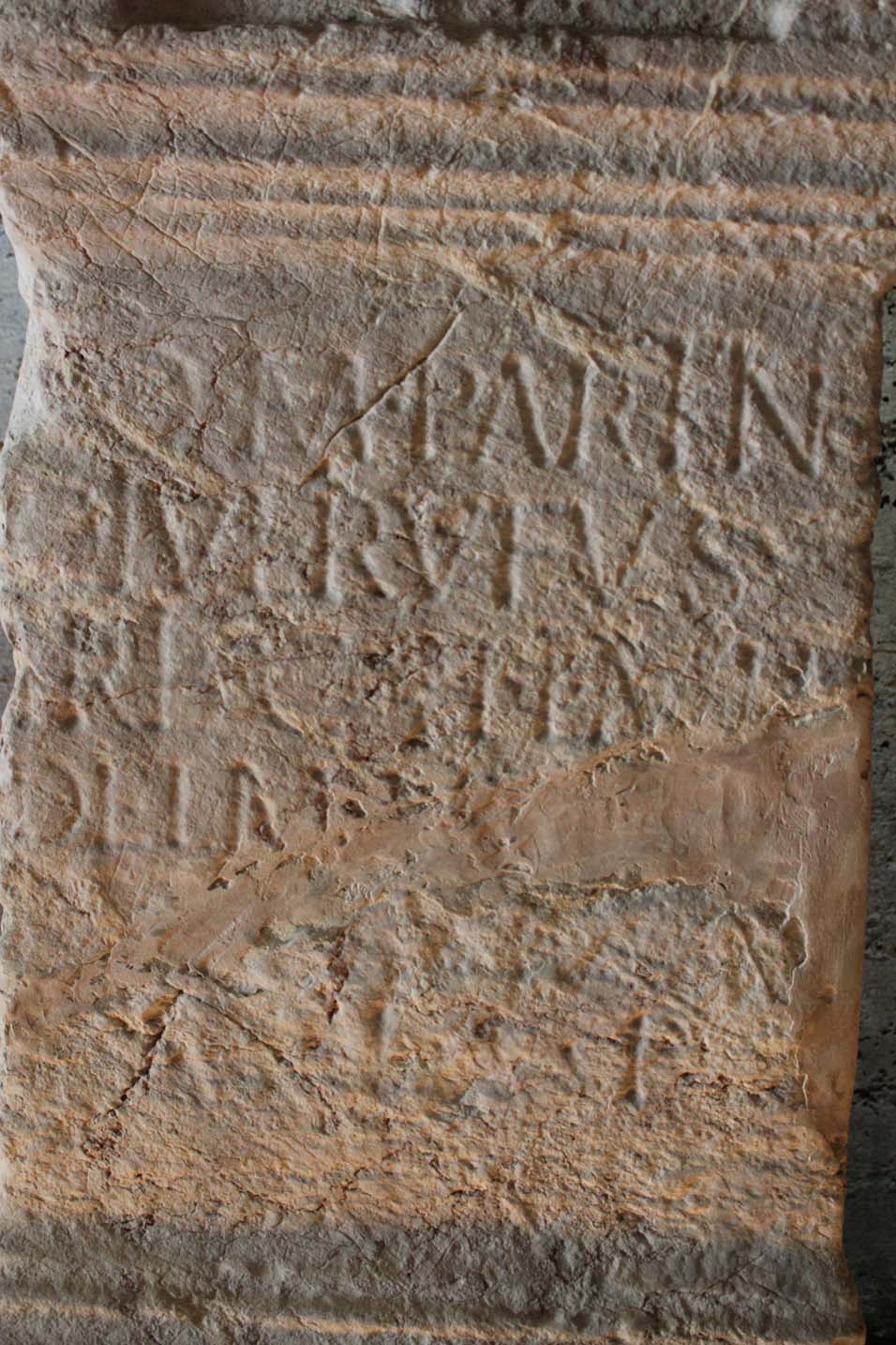 6.5-5 cm. Triangular punctuation. Ligatures: 1 IN; 3 IB. Elongated letters: 1 I, T. Small letters: 1 O, I at the of the line; 3 O; 4 O. Name of the emperor carefully erased in lines 5-6, only the last letter on line 6 visible.
